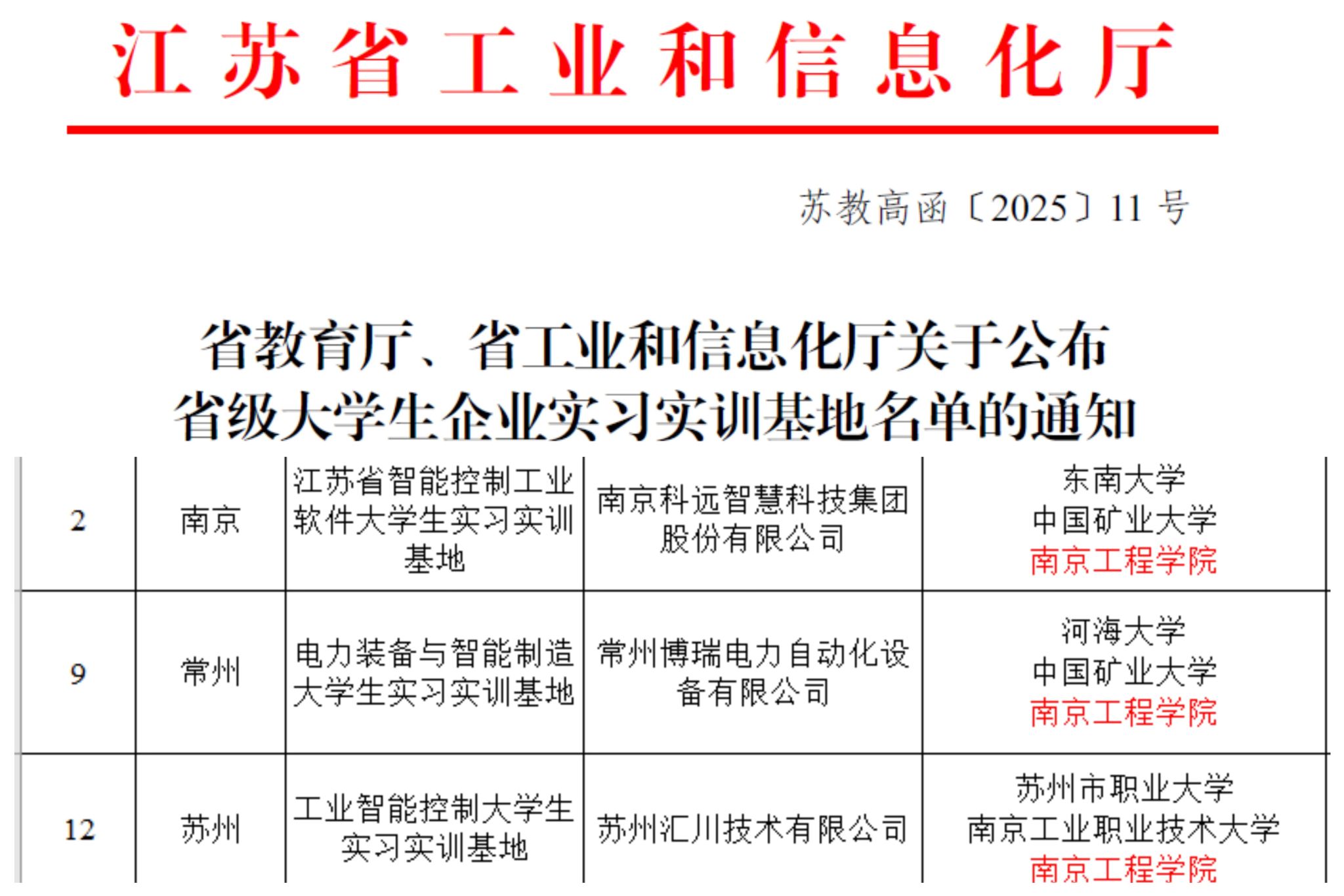 近日,江苏教育厅联合江苏省工业和信息化厅发布《省教育厅、省工业和信息化厅关于省级大学生企业实习实训基地名单的通知》(苏教高函〔2025〕11号),我校共建的3个实习实训基地成功入选,彰显了我校在产教融合、实践育人等方面的工作成效。实习实训基地是凯发组织高水平实践教学、培养高素质创新应用人才的重要教学基地。一直以来,凯发坚持以培养学生创新精神和实践能力为核心,高度重视实践教学基地建设,出台《凯发k8官网...